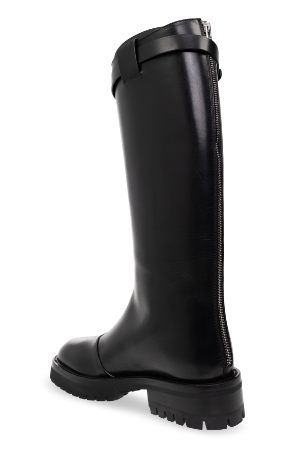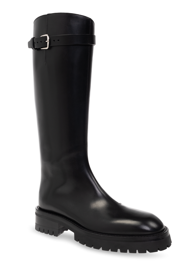 Black ‘Nes’ boots from Ann Demeulemeester. Crafted from leather, this design sits on a black sole made of leather and rubber and features a round toe, side zip and an adjustable, decorative strap with a silver-tone buckle on top.