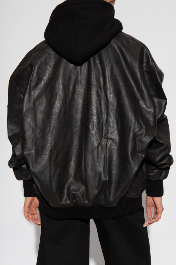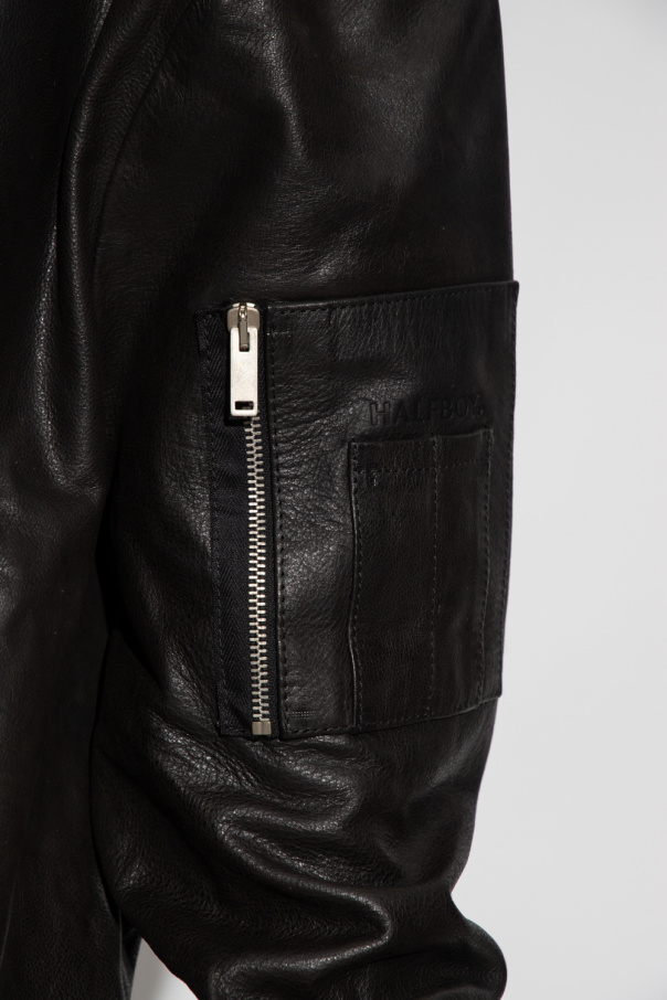 Black loose-fitting bomber jacket from Halfboy. Crafted from sheep leather, this long sleeve design features a zip fastening, two snap-fastened front pockets, sleeve pocket with an embossed logo and ribbed trims.