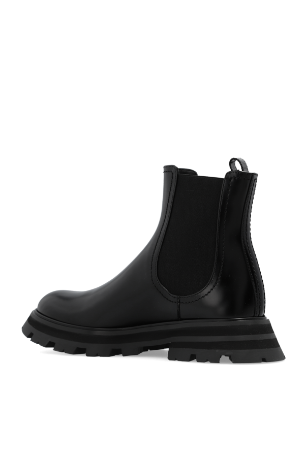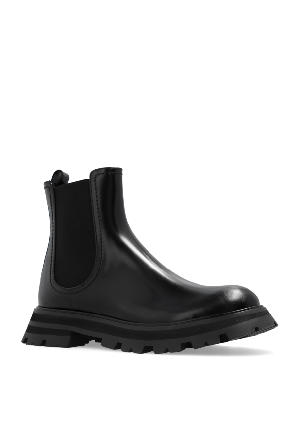 Black Chelsea boots from Alexander McQueen. Crafted from leather with a slip-on silhouette, this model sits on a black rubber sole and features an almond-shaped toe and elastic panels on the sides.