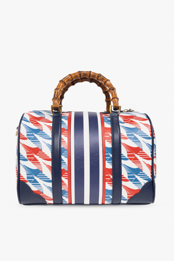 White, red and navy shoulder bag from Casablanca. Made of leather, this model features a two-way zip, pattern inspired by airlines aesthetic, white and navy stripe at the back, two bamboo handles, detachable and adjustable shoulder strap, gold-tone metal hardware and one internal compartment with one slip pocket.