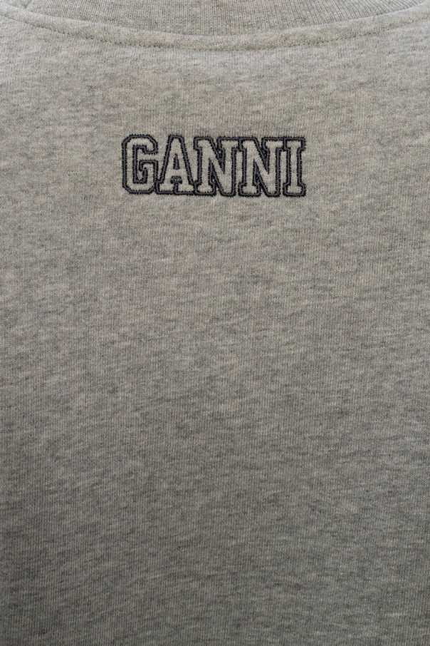 Grey crewneck sweatshirt from Ganni. Spun from certified recycled yarns, this style comes embroidered with the brand's logo on the back and detailed with side slits and ribbed finishes.