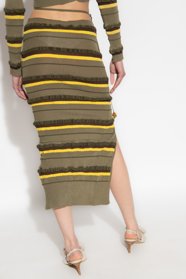 Green, yellow and brown ‘Concha’ pencil skirt from Jacquemus. Crafted in part from recycled material with a ribbed texture, this style features a stripe pattern, a thin waist belt with a round appliqué, decorative asymmetrical slits with buttons on the sides and elasticized trims on the top and bottom hems.