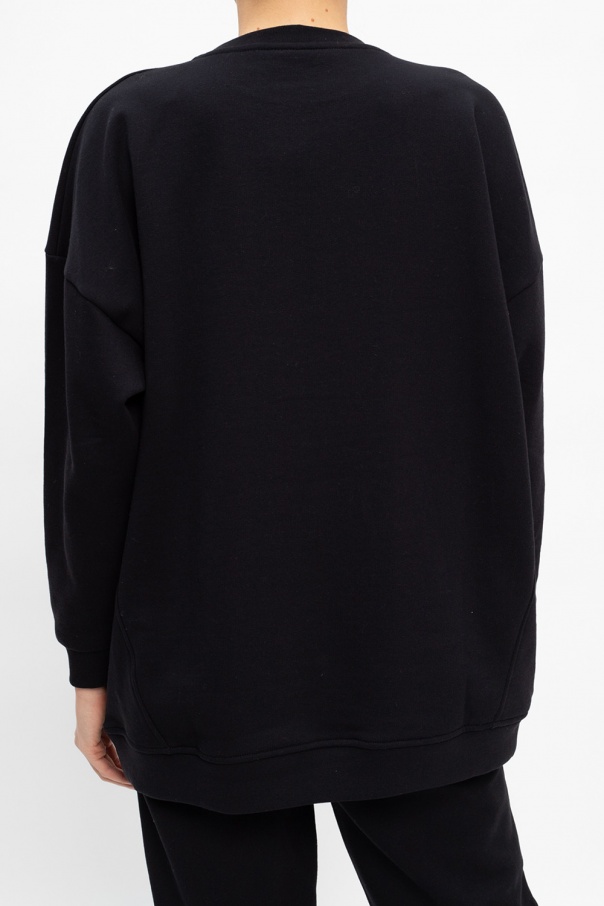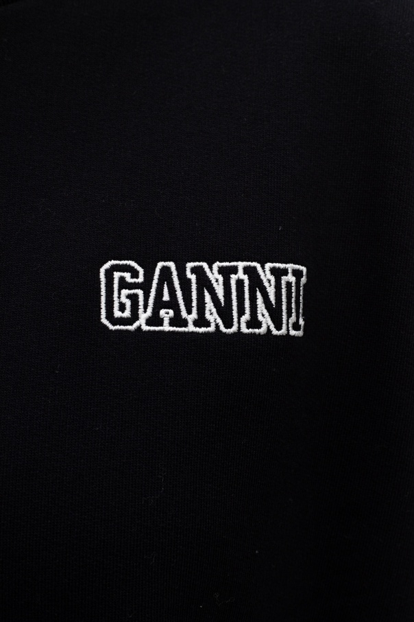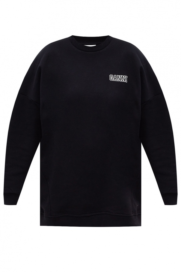 Black crewneck sweatshirt from Ganni. Cut from cotton jersey with an oversize silhouette, this style showcases white embroidered detail with the brand's logo and rib-knit finishes at the collar, bottom hem and cuffs.