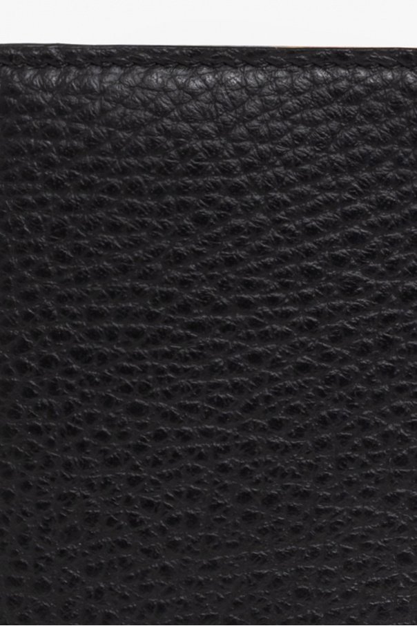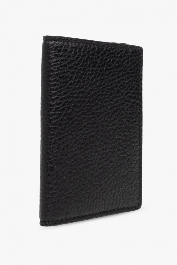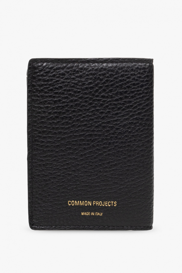 Black bifold card holder from Common Projects. Made of grained leather, this item features a gold-tone logo print, beige lining and six internal card slots.