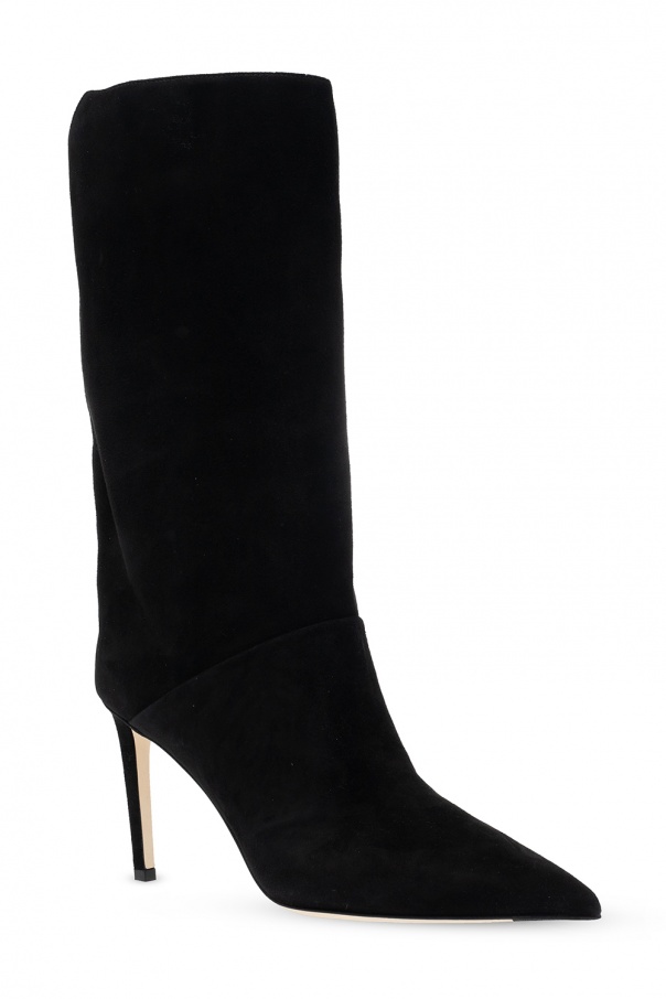 Black 'Beren' knee-high boots from Jimmy Choo. Crafted from suede, this pair boasts a pointed toe silhouette set on a beige and brown rubber-injected leather sole and detailed with a cut-out hem and a gold-tone logo plaque.