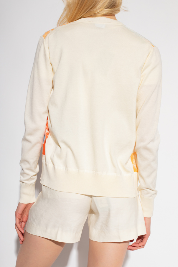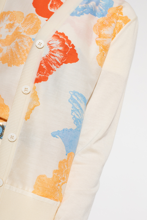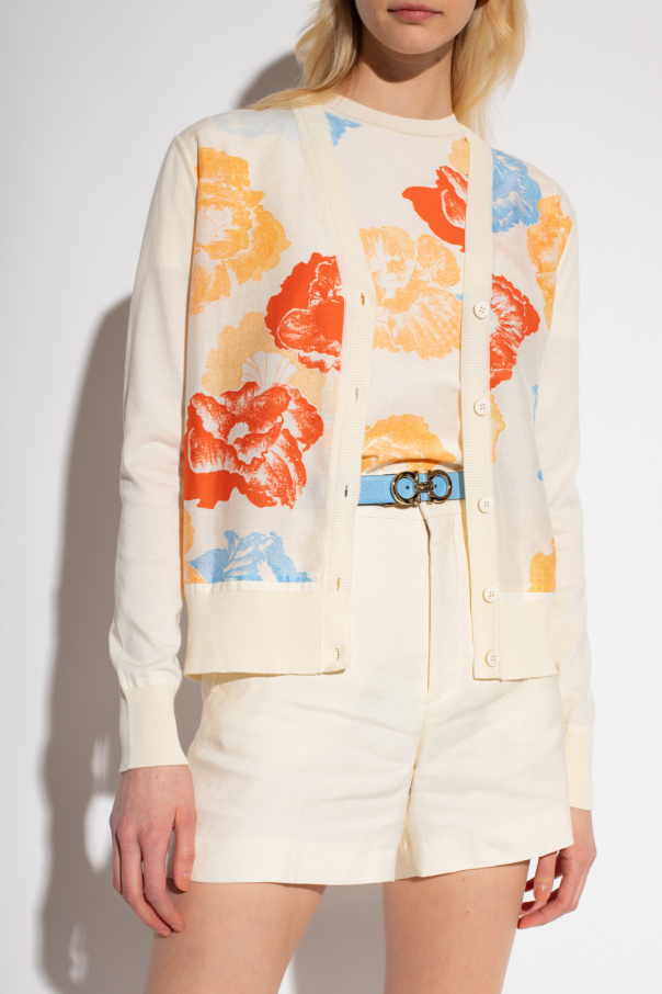 Cream cardigan from Salvatore Ferragamo. Made of a cotton and silk bend, this V-neck design features button fastenings, multicolored floral print and ribbed trims at the hem and cuffs.