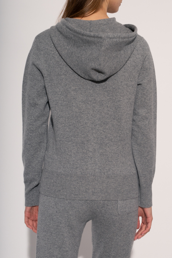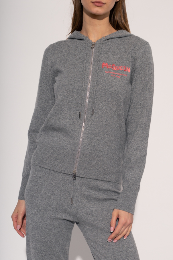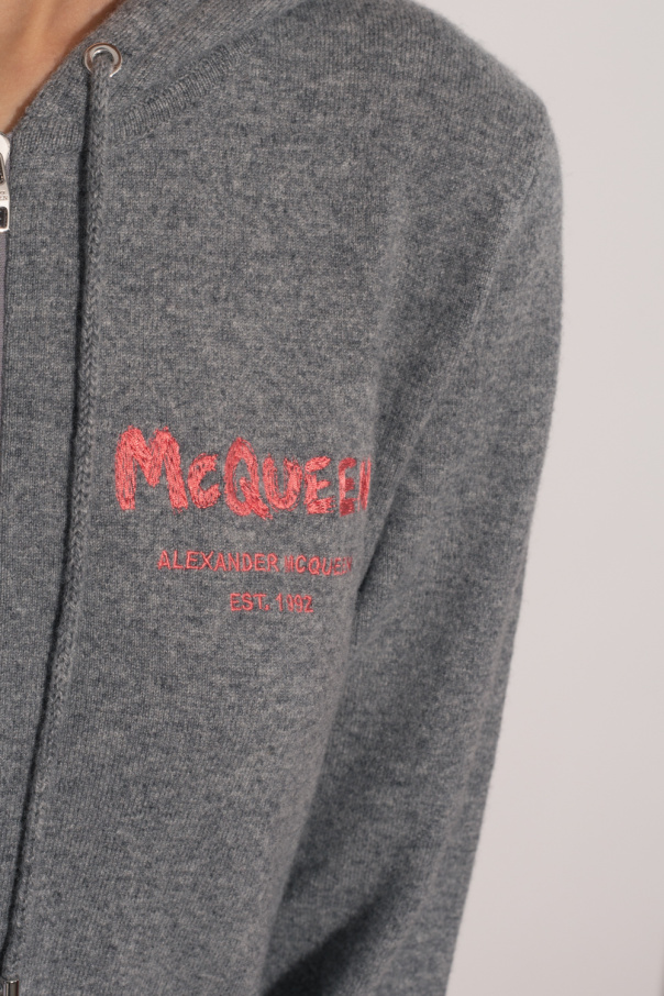 Grey sweatshirt with a drawcord-adjustable hood from Alexander McQueen. Crafted from cashmere, this style features a zip fastening, pink graphic embroidery with the brand's logo and ribbed trims on the bottom hem and cuffs.