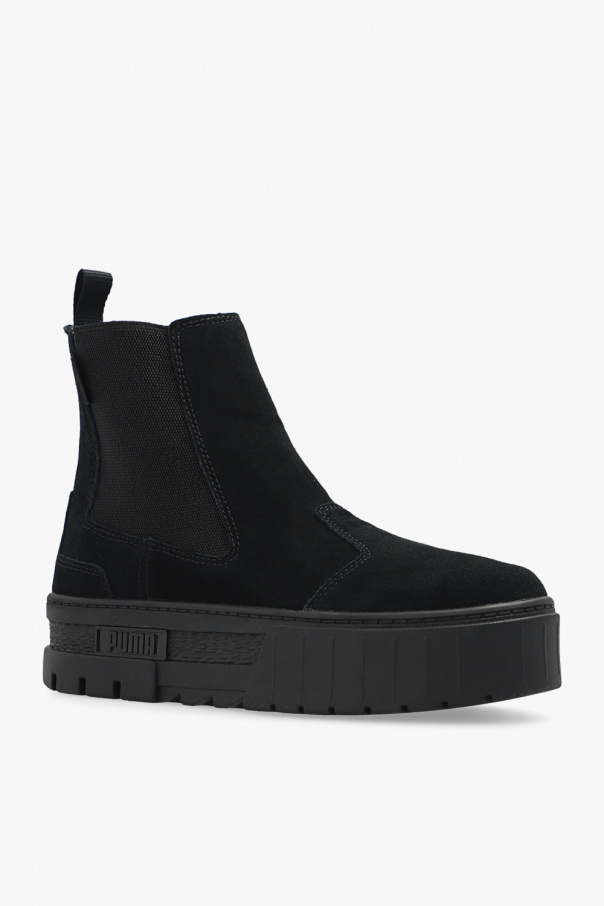 Black ‘Mayze’ platform Chelsea boots from Puma. Made of suede, this pair features elastic side panels, logo patch and black rubber sole.