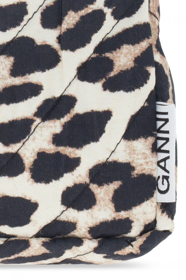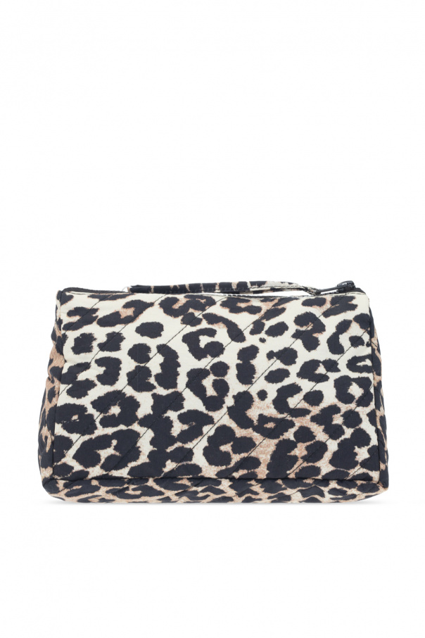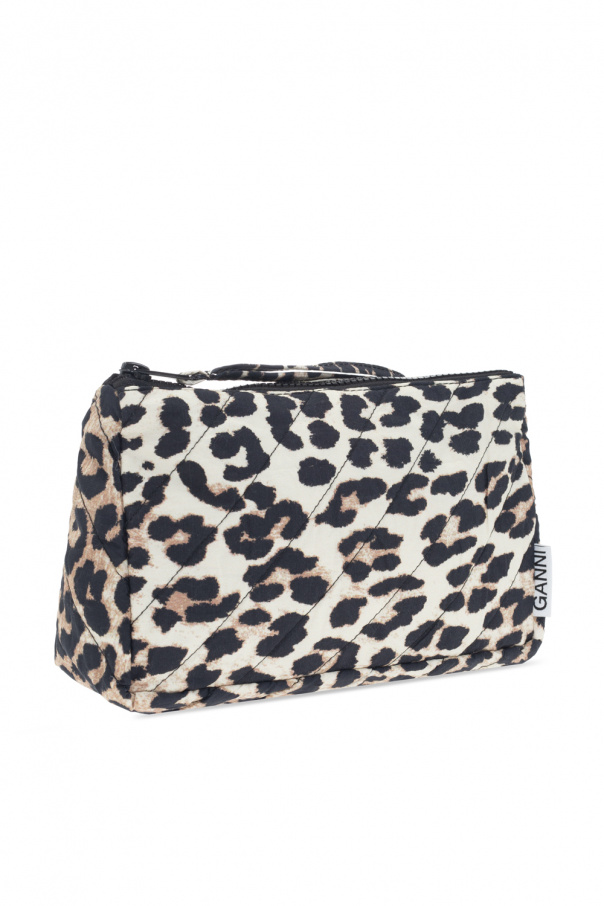 Cream, black and brown wash bag from Ganni. Crafted from cotton, this item features a zip closure with a wrist strap, an animal motif and one internal compartment with one slip pocket.
