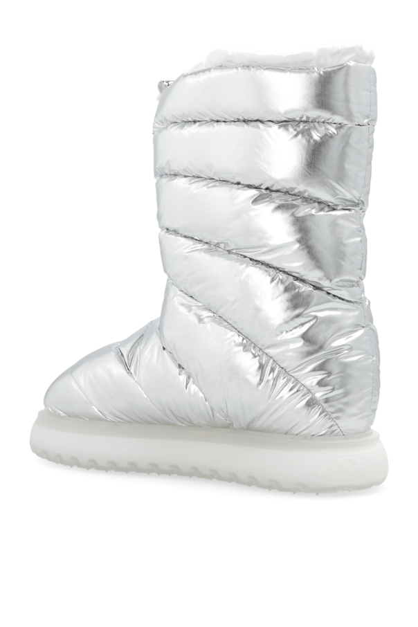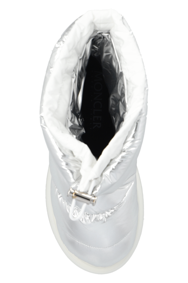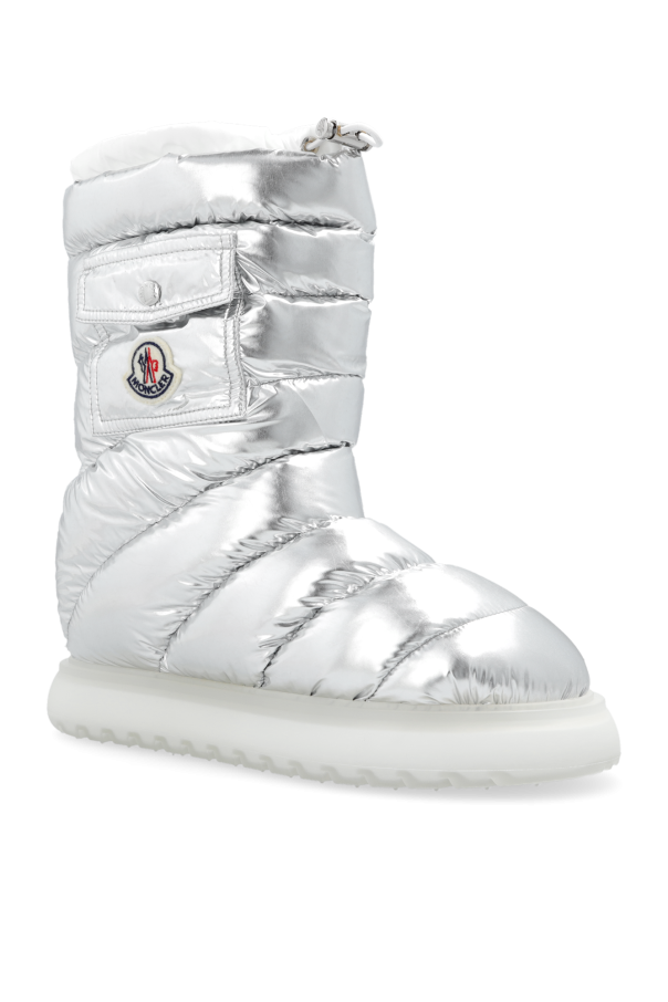 Silver-tone and white ‘Gaia’ snow boots from Moncler. Crafted from waterproof fabric, this pair sits on a white rubber sole and is complete with drawstrings at the cuff as well as a snap-fastened flap pocket and logo patch to the side.