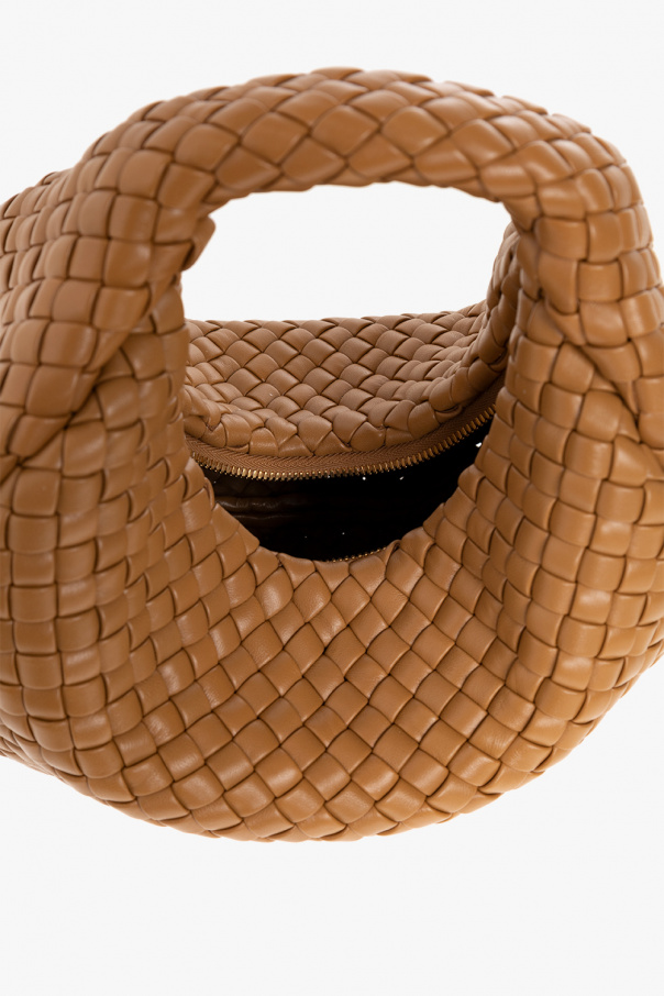 Light brown ‘Padded Jodie Mini’ handbag from Bottega Veneta. Crafted from lamb leather with the brand’s signature Intreccio weave, this model is complete with a zip fastening, half-round handle, one internal compartment and gold-tone metal hardware.