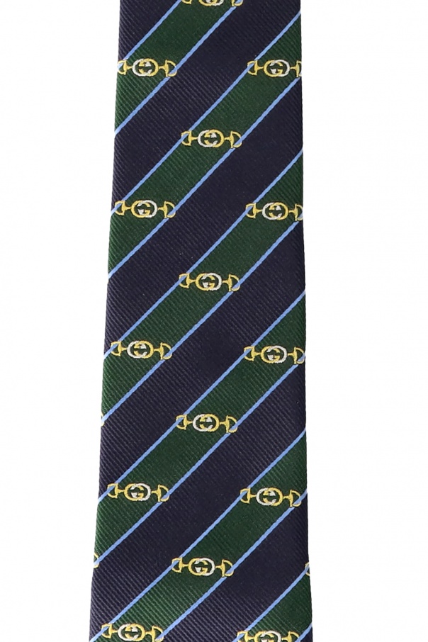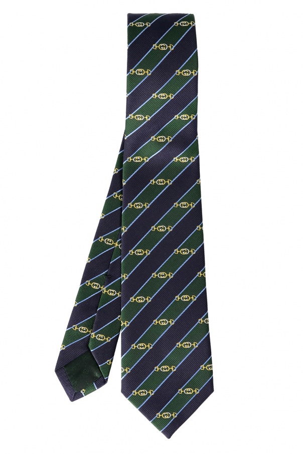 Navy blue and green tie from Gucci. Crafted from silk, this accessory is woven with a logo pattern.