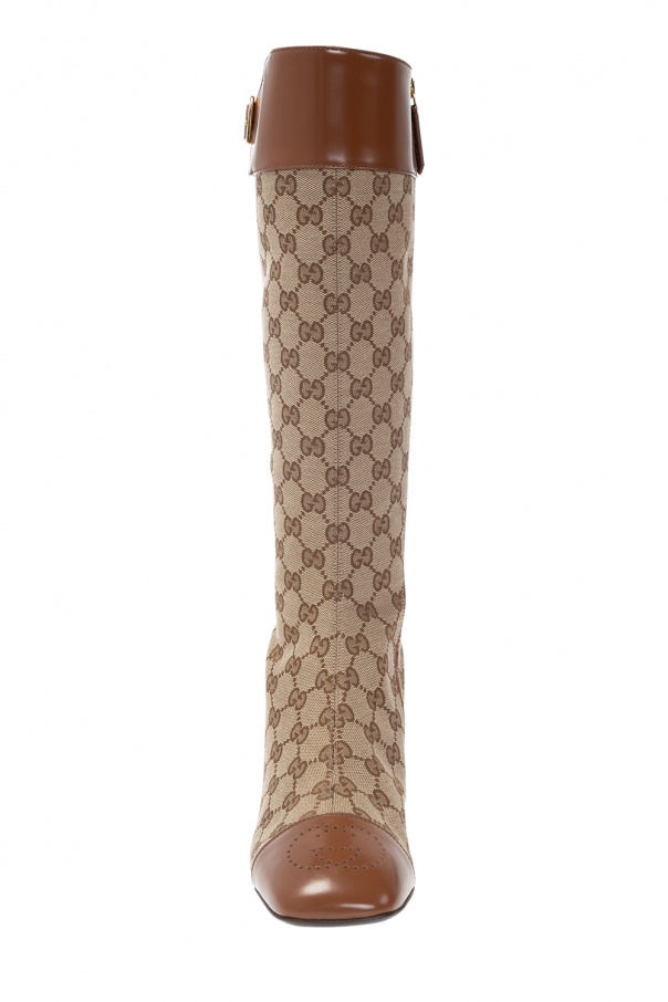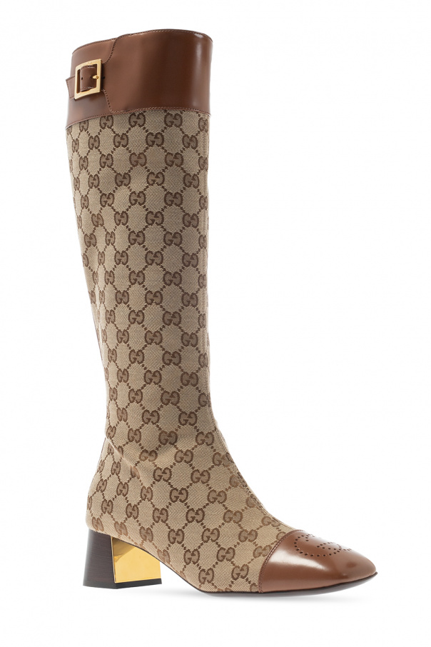 Beige and brown knee-high boots from Gucci. Crafted from leather and ‘GG Original’canvas, this model sits on a brown leather sole and features a side zip closure, logo perforations and a strap detail with a gold-tone buckle.