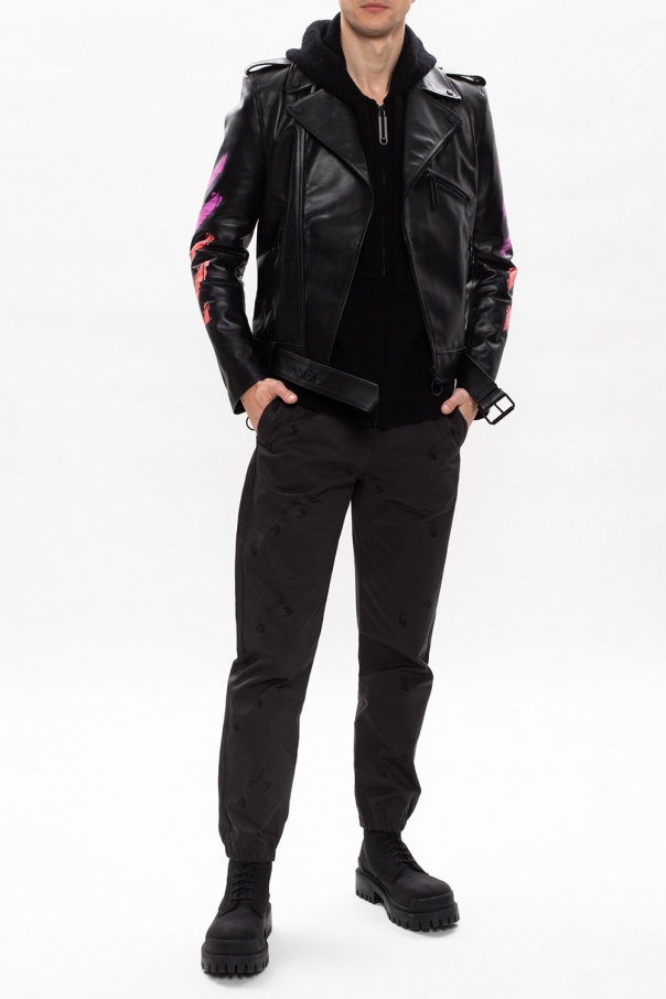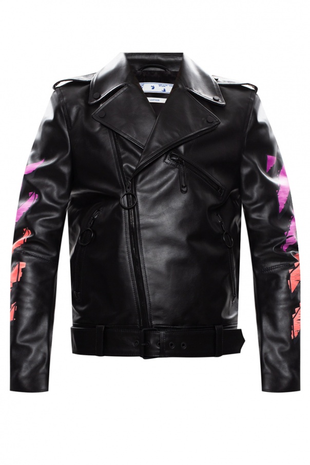 Black biker jacket from Off-White. Spruced up with the brand's signature motif of arrows in purple and orange, this leather-crafted garment fastens via a zip accentuated with a ring puller and employs three zipped pockets on the front, epaulettes on the shoulders and a cinching leather belt at the waist.