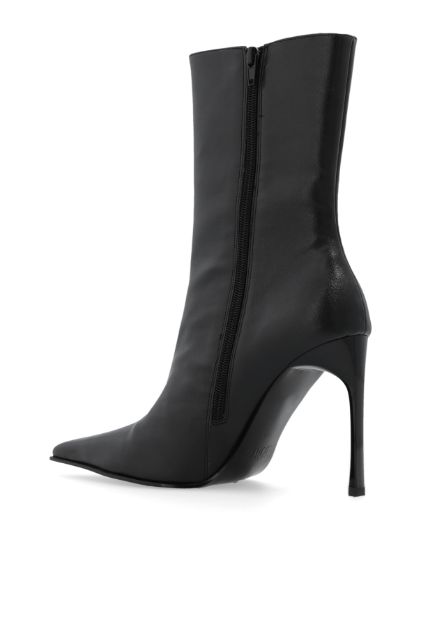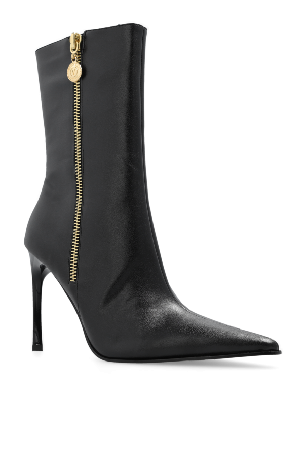 Black heeled boots from Versace Jeans Couture. Made of faux leather, this pair features a zip fastening, decorative gold-tone zip on the side, pointed toe and black rubber sole.