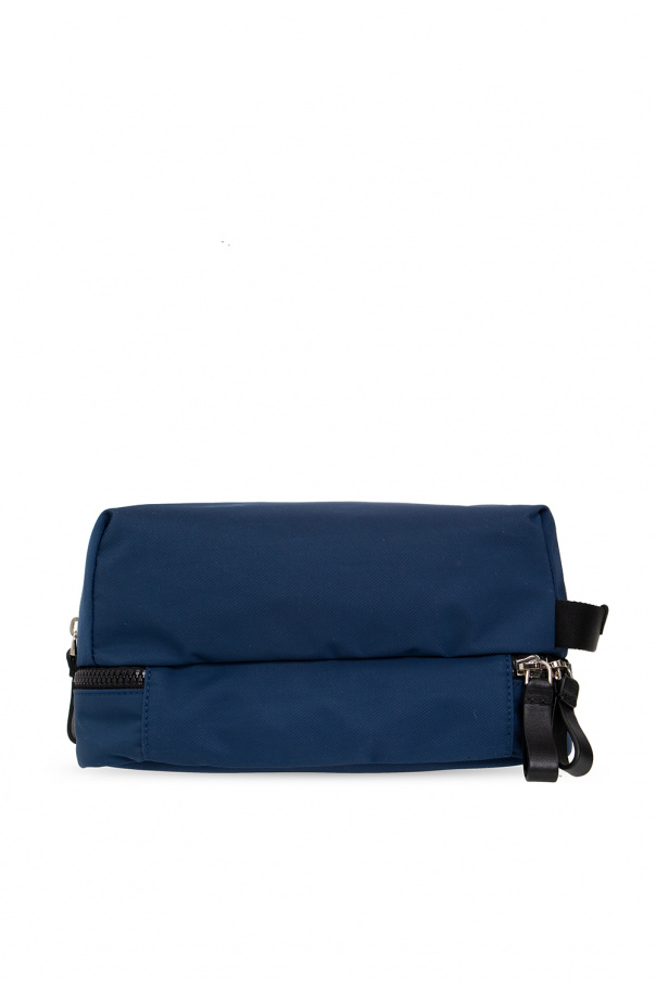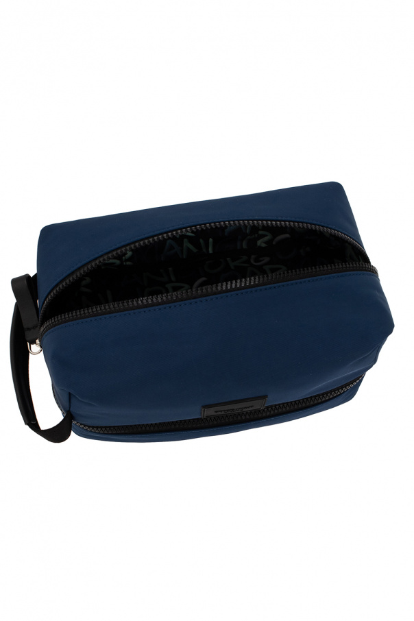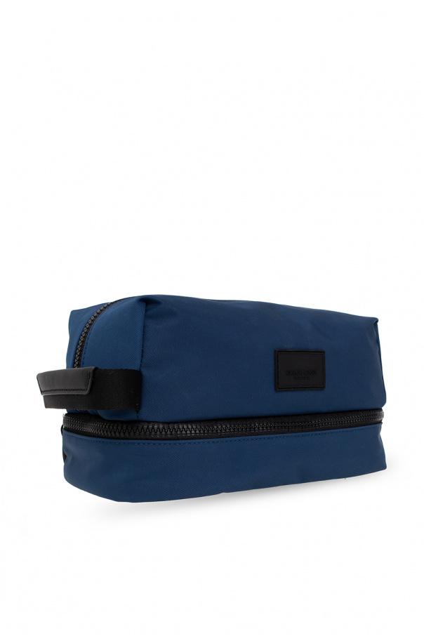 Blue and black wash bag from Giorgio Armani, the ‘Sustainable’ collection. Made of recycled materials with calf leather trims, this design features two separate zipped compartments, logo patch, side handle, silver-tone metal hardware and lining with a multicolored logo print.