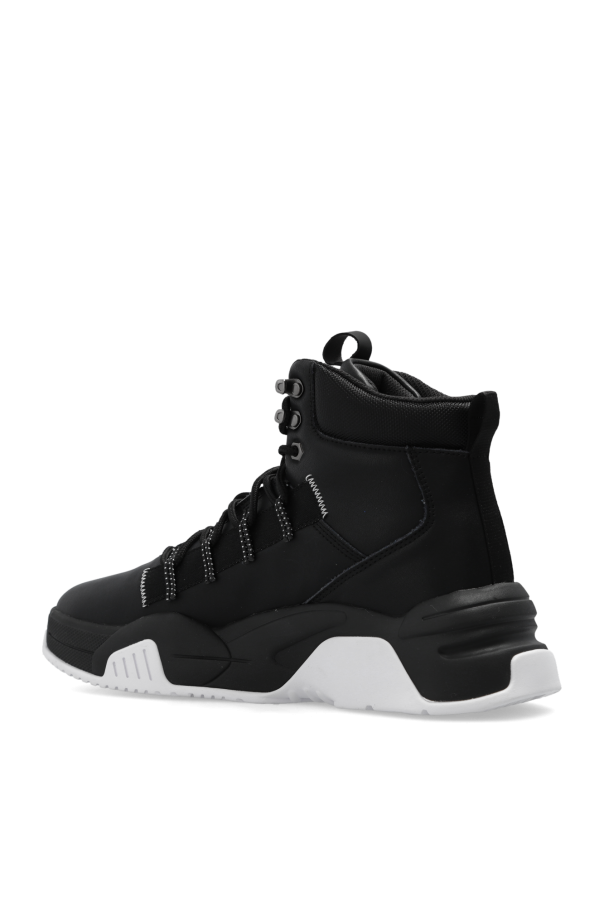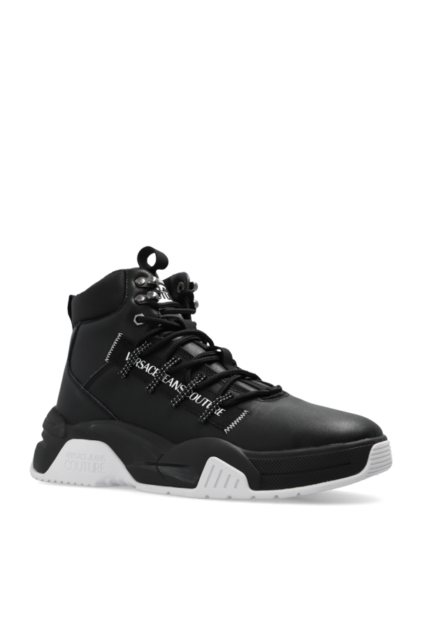 Black sneakers from Versace Jeans Couture. Made of leather with a high-top silhouette, this lace-up model sits on a white rubber sole and showcases a white logo print and a grosgrain pull tab on the back.