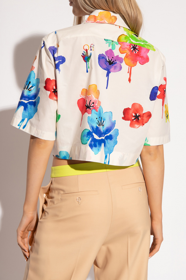 Cream shirt from Off-White. Made of cotton, this garment features a zip fastening, multicolored printed floral pattern, front pocket and short sleeves.