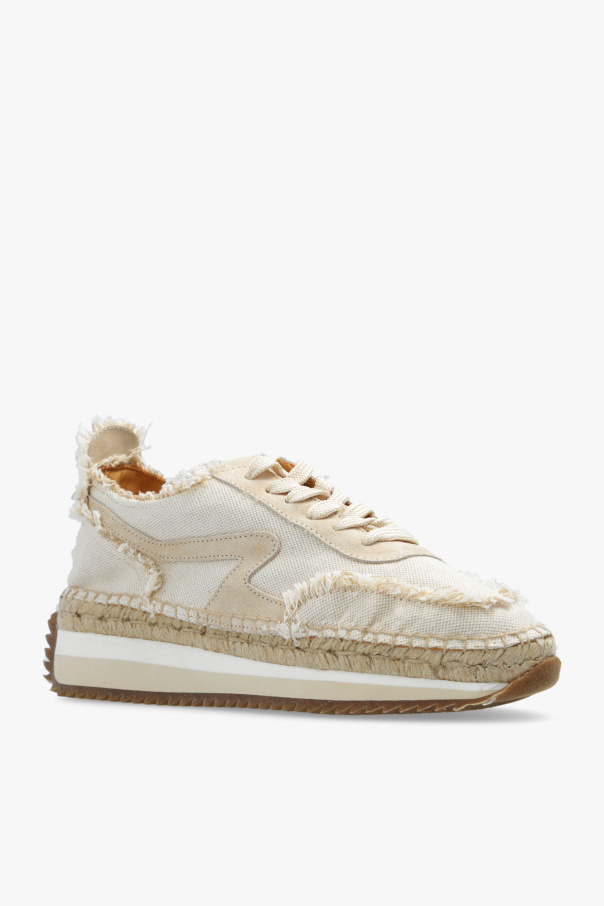 Beige ‘Retro Runner’ sneakers from Rag & Bone. Crafted from a cotton and linen blend, this lace-up pair features a patch, raw cut edges and rubber jute-trimmed sole in brown, cream and white.