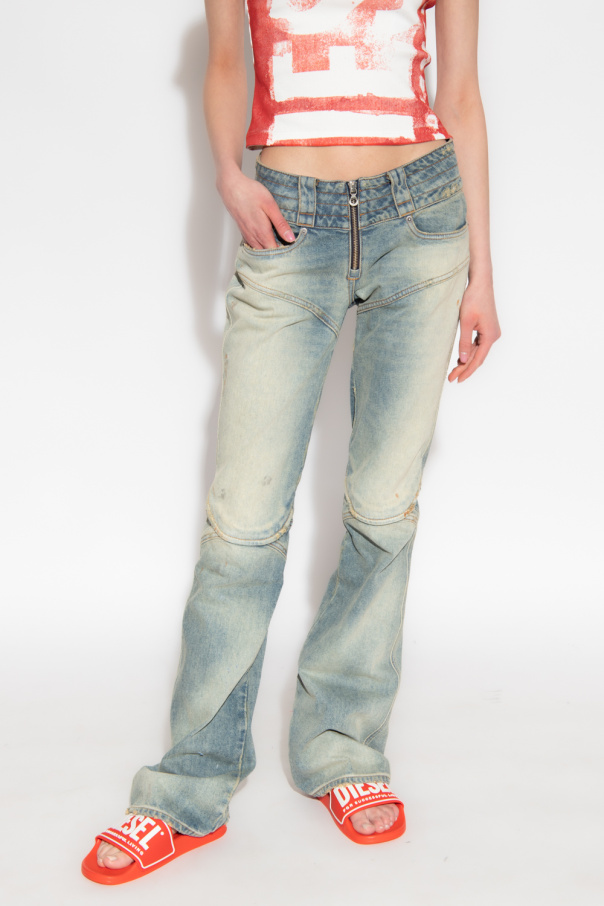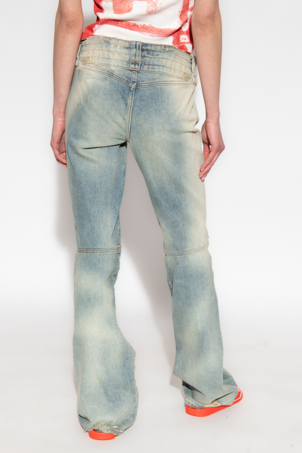 Blue ‘D-BELTY L.32’ bootcut jeans from Diesel. Cut with a low-rise waist, this pair falls with flared legs and features a zip fly, distressed and overdyed detailing for a vintage effect, three slip pockets and a logo patch on the front.
