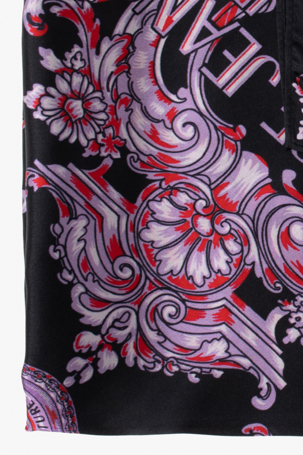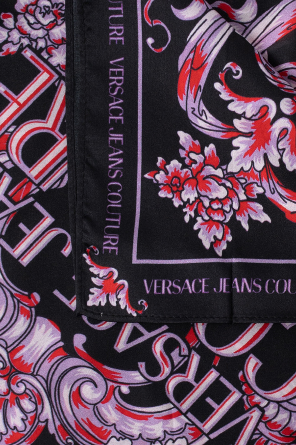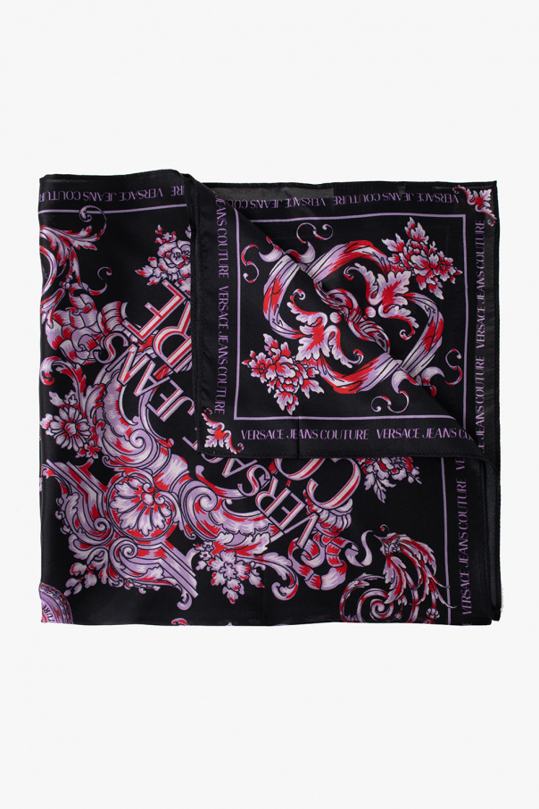 Black, purple and red scarf from Versace Jeans Couture. Crafted from silk, this item is decorated with an all-over print.