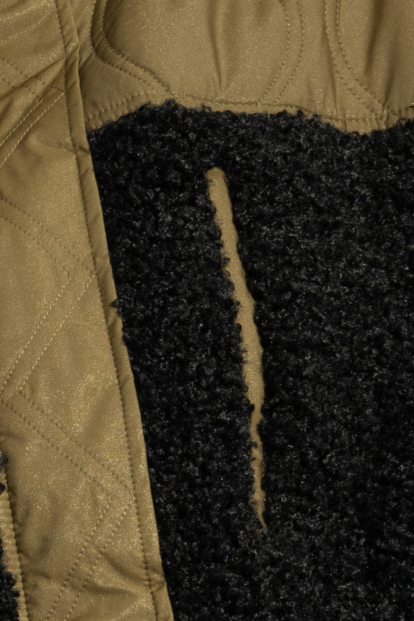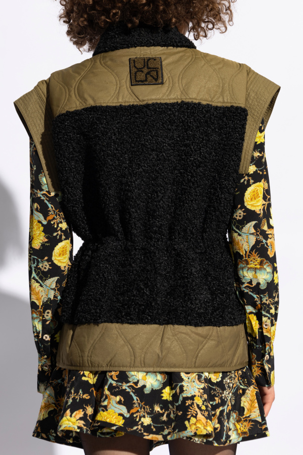 Introducing the "Shiloh" Vest by renowned designer Ulla Johnson, a pinnacle of avant-garde fashion that marries functionality with high-end allure. Crafted from a 100% polyester outer and inner layer, this piece stands out in a sophisticated palette of khaki and black, embodying the essence of luxury outerwear. The vest's matte green canvas is intricately quilted, adding a tactile dimension to its appearance. Accentuating its form, the front features plush, textured black panels that mimic the opulence of fur or thick down, strategically placed along the zipper and waistline to sculpt and define. Green elastic ribbed inserts on the shoulders and sides ensure a blend of elegance and comfort, making the "Shiloh" as functional as it is fashionable. Designed with a modern silhouette in mind, it features a high collar, zip and snap button closure, and a subtly rounded, extended back hem for an added touch of sophistication. The vest's exclusivity is further marked by the signature logo of Ulla Johnson, rendered in contrasting material and texture, adorning the upper back. A closer inspection of the black fabric reveals a meticulous attention to quality and finish, highlighting the vest's luxurious character and thoughtful design. Why Buy This Product? Exclusive design by Ulla Johnson, ensuring uniqueness and high-fashion appeal. Harmonious blend of textures and materials, offering a visually stunning piece. Optimal blend of style and practicality, with thoughtful details like zip and snap closures for ease of wear. Signature logo detail enhances the vest’s exclusivity and designer appeal.