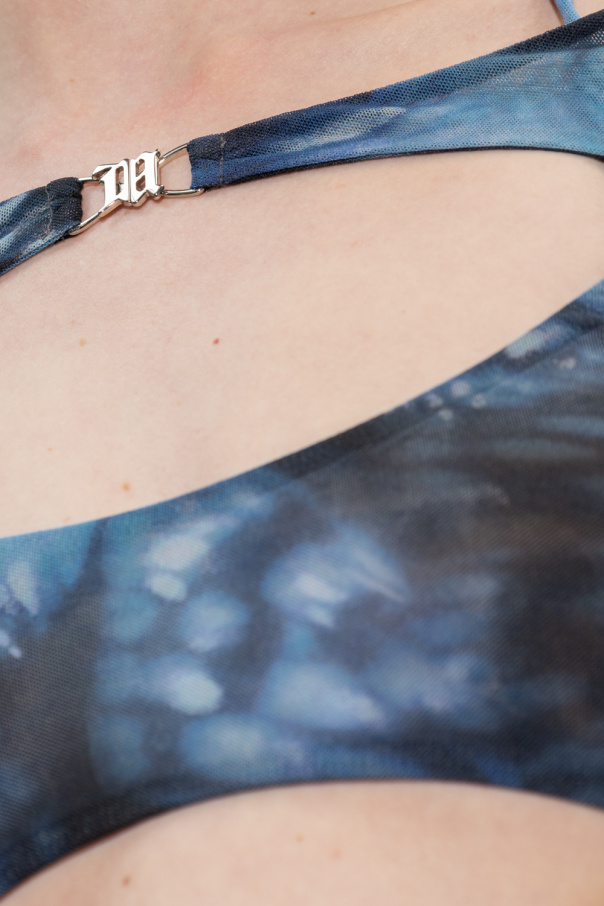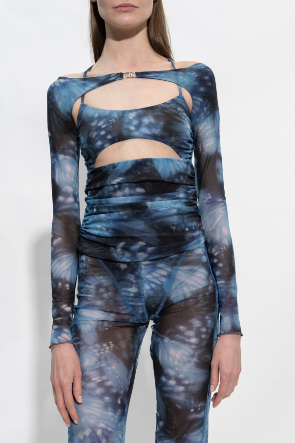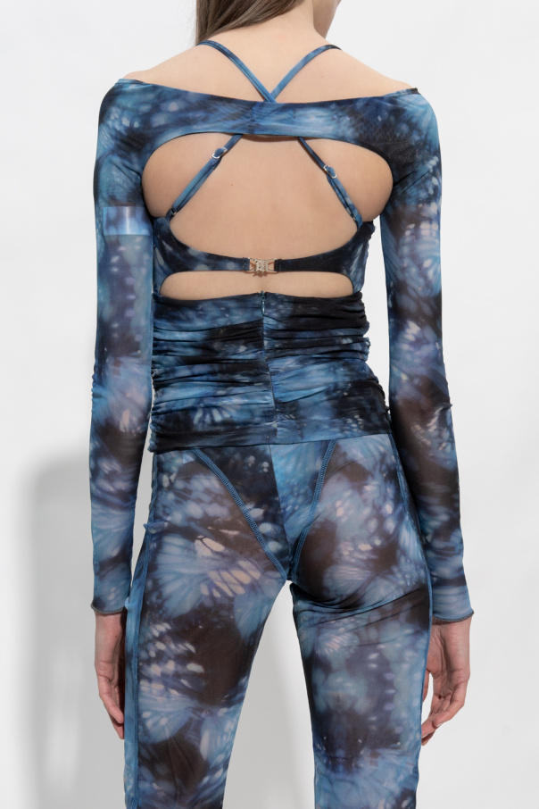 Blue and navy ‘Mesh Butterfly’ top from MISBHV, the ‘Garden Of Dreams’ collection. Fastened with a silver-tone branded clasp, this long sleeve design is decorated with a pattern.