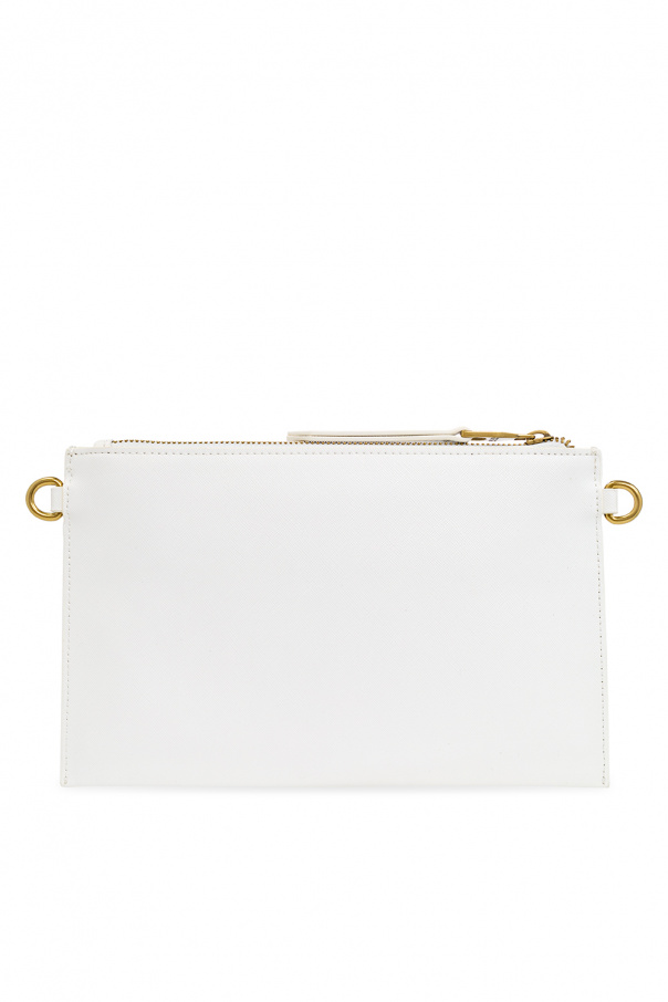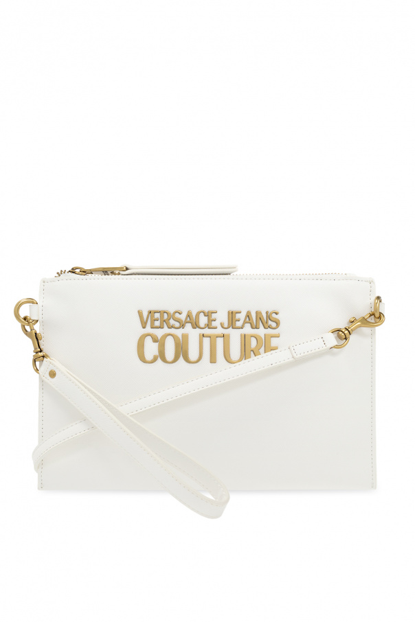 White shoulder bag from Versace Jeans Couture. Crafted from faux-leather, this design secures with a zip and features a metal logo plaque on the front, a detachable wrist strap on the side, a detachable and adjustable shoulder strap, gold-tone metal hardware and one internal compartment with one zip pocket and one slip pocket.