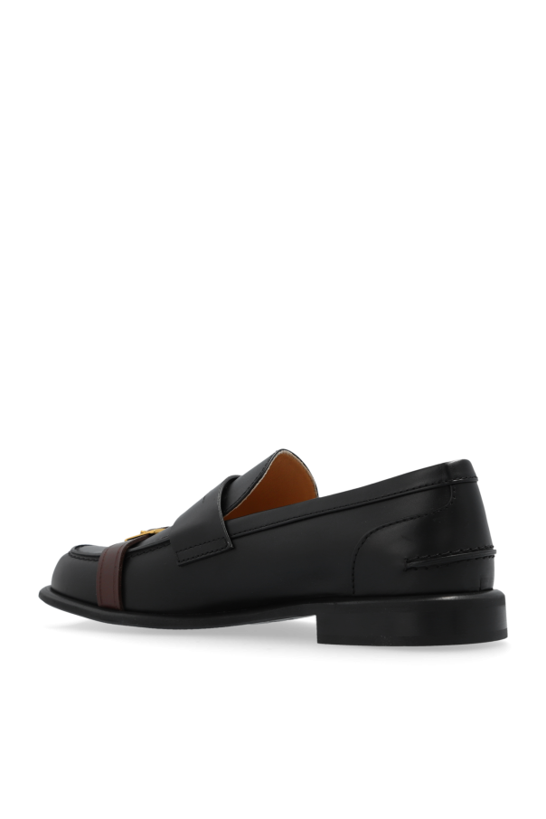 Black loafers from JW Anderson. Made of leather, this pair sits on a black rubber sole and features a strap with a cut-out, a brown strap with a metal logo-engraved buckle in gold-tone.