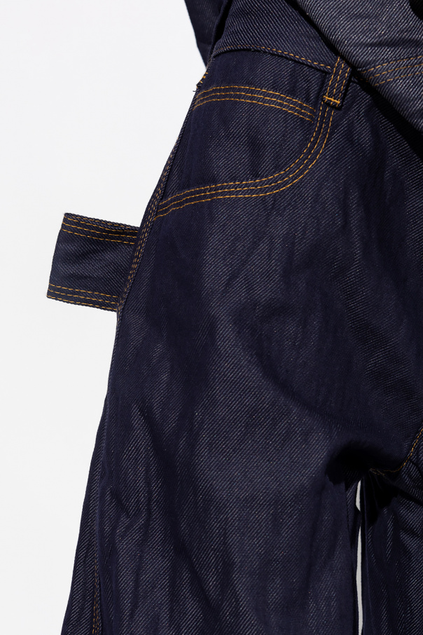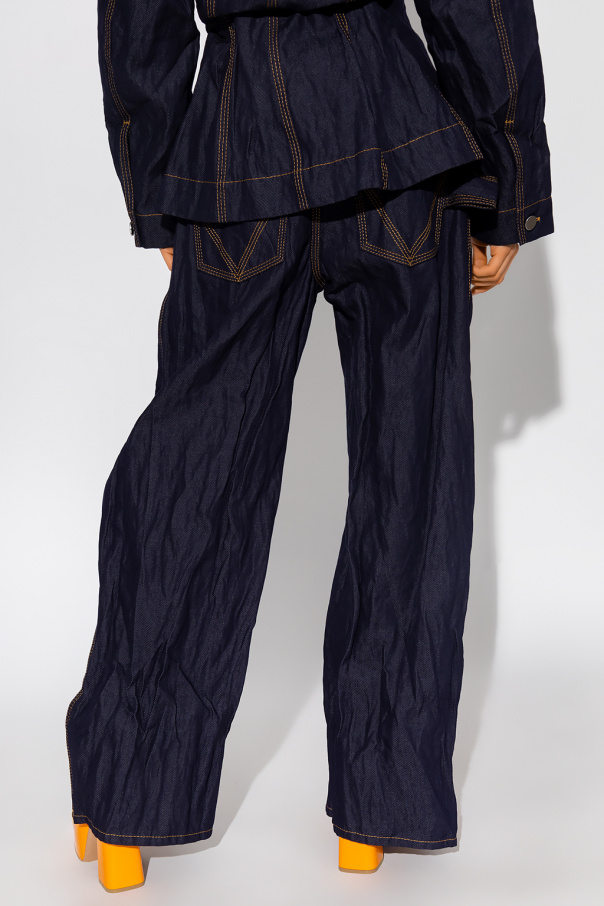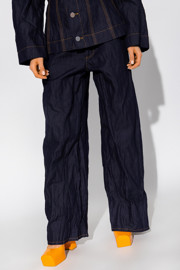 Navy blue jeans from Bottega Veneta. Crafted from metallic twill, this pair falls with flared legs and features button closures, contrasting yellow stitching details and classic five pockets.