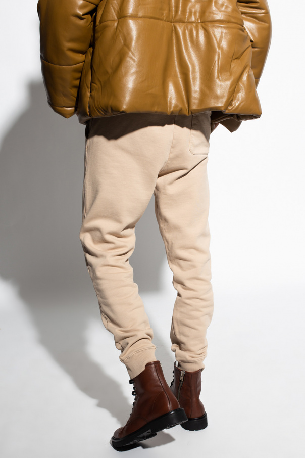 Beige sweatpants from Samsoe Samsoe. Made of organic cotton with the GOTS-tex certificate, this pair features an elastic waistband with drawstrings, black logo print and ribbed cuffs.