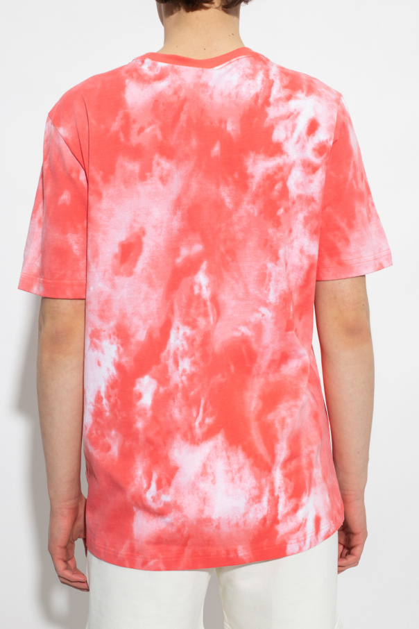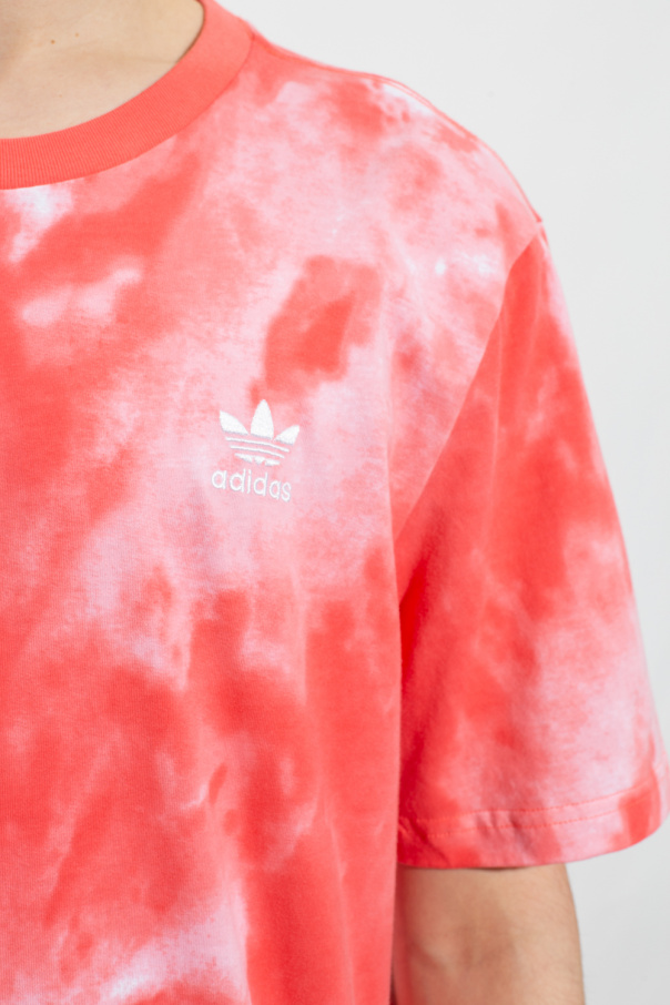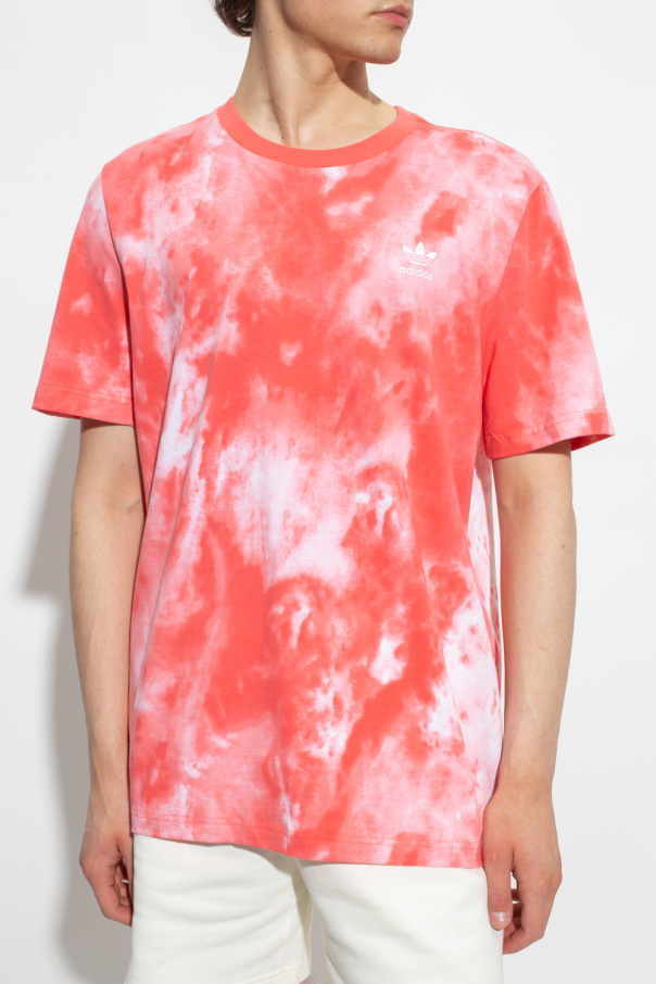 Pink and white crewneck T-shirt from ADIDAS Originals. Made of tie-dyed cotton, this style features short sleeves, an elasticated collar and an embroidered logo on the front.