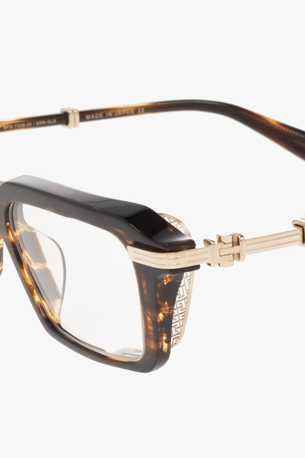 Brown ‘Legion-III’ optical glasses from Balmain. Made of glossy acetate with a transparent pattern, this design features rectangular frames with a single bridge and integrated nose pads, cut-out panel with a monogram, decorative temples with a logo and light gold-tone metal hardware. Case included.