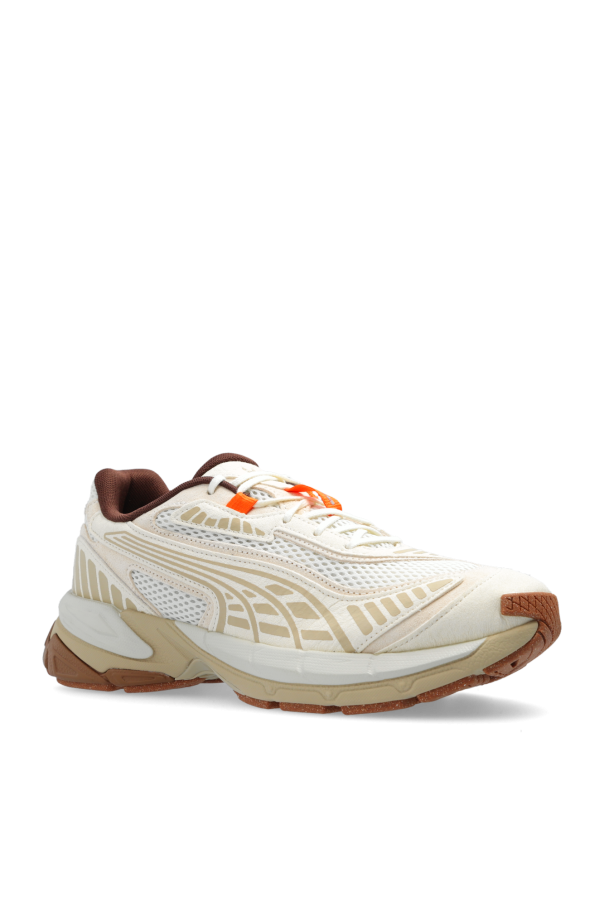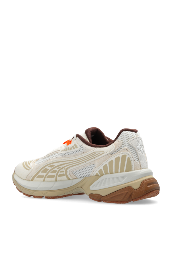 Cream, beige and brown ‘Velophasis V002’ sneakers from Puma x PAM. Made from suede and sporty mesh, this lace-up model showcases the brand's logo and orange stripes. The beige, brown and purple features the PWRPlate technology for maximum performance and stability while running.