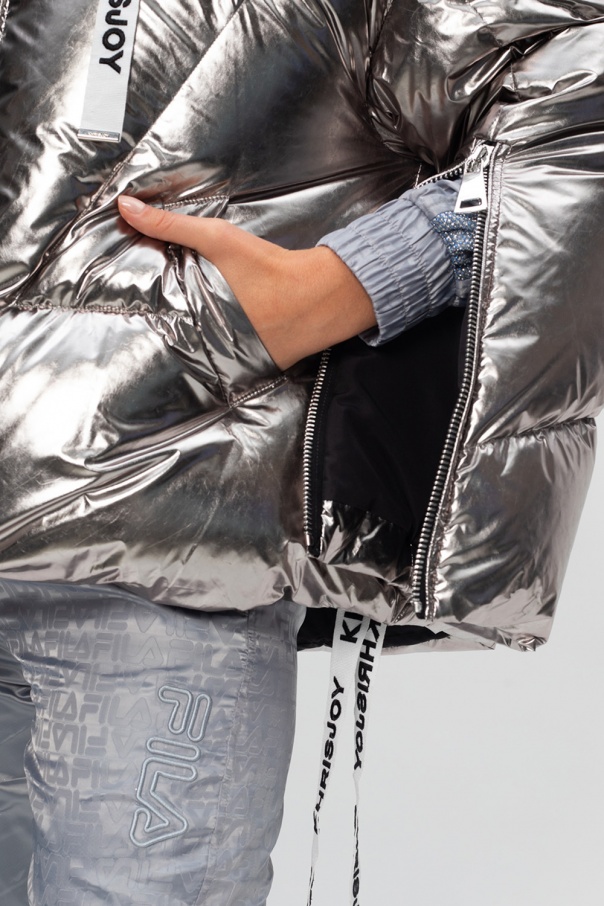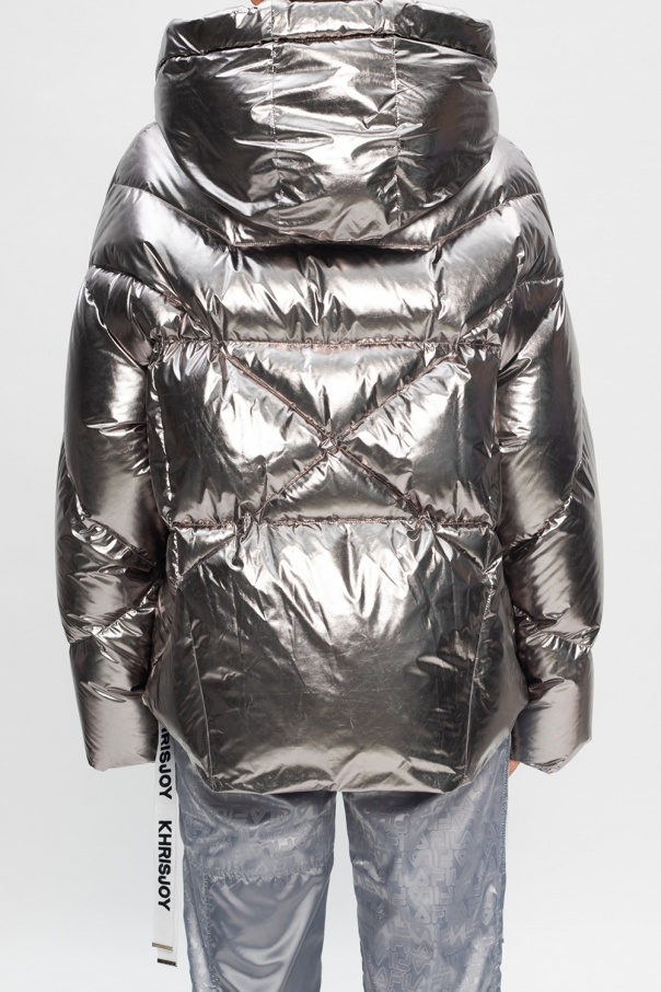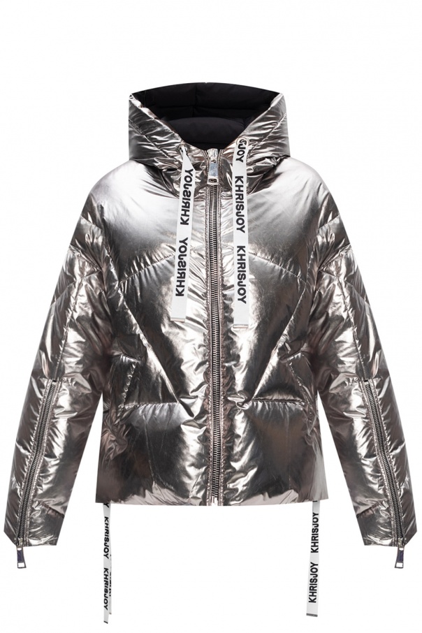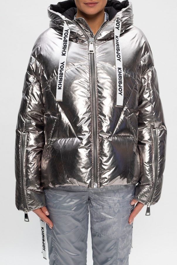 Silver-tone jacket with a drawcord-adjustable hood from Khrisjoy. Clad in shimmering material, this puffer jacket was filled with goose down for ultimate warmth. It is complete with zip fastening, long sleeves with decorative zip closures, silver-tone hardware details, two slip pockets and unique branded drawcords at the hem.