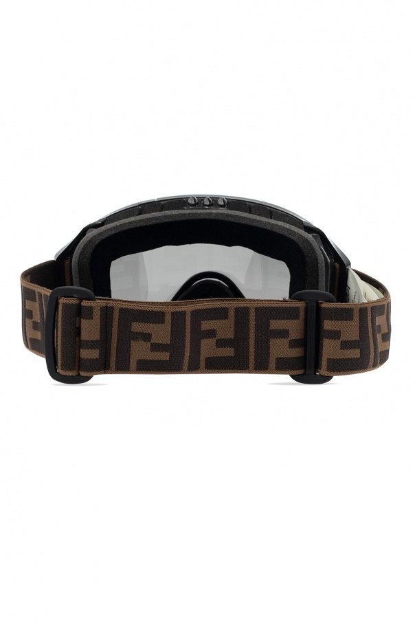 Black ski goggles from Fendi. This item features studs, logo-printed lenses, foam and adjustable brown and black strap with a logo.