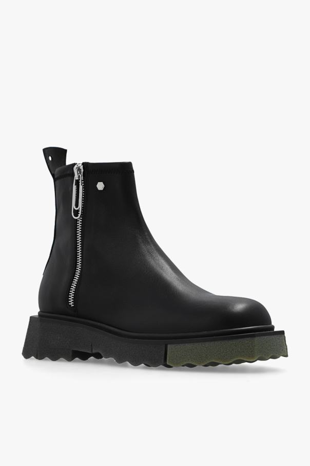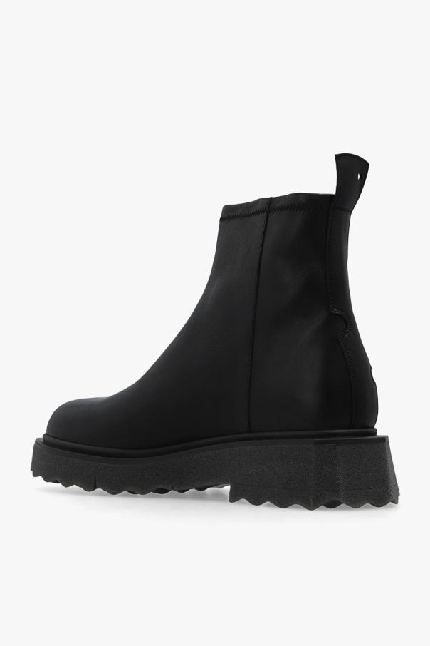 Black ‘Sponge’ ankle boots from Off-White. Made of leather, this pair features a side zip, round toe and grey rubber sole.