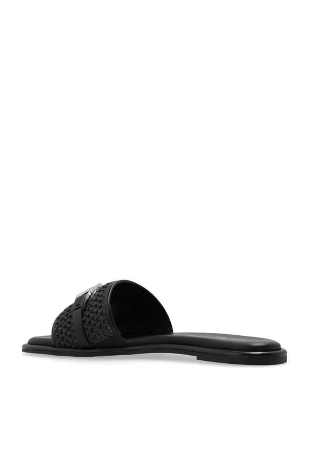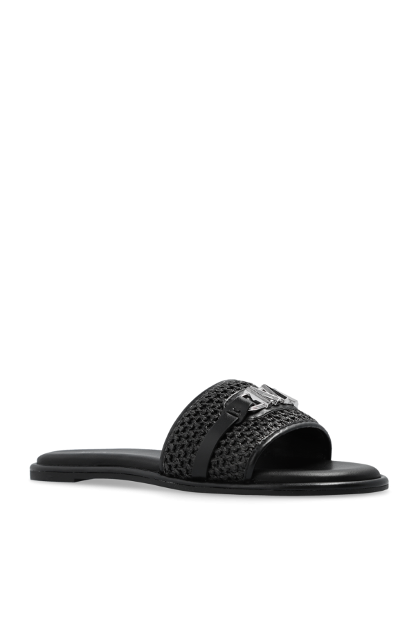 Introducing the "Ember" Slides by the illustrious Michael Michael Kors, a testament to the harmonious blend of simplicity and luxury. These slides, hailing from an exclusive collection, epitomize the essence of chic sophistication with their classic silhouette featuring a broad strap across the midfoot, meticulously crafted to ensure an unparalleled level of comfort and style. The Ember is adorned in an opulent black hue, with the strap boasting a textured material that hints at the use of an intricate weave or embellished fabric, adding a touch of elegance to its overall appearance. The signature, large metallic logo of the designer prominently displayed on the strap serves not only as a hallmark of quality but also as a beacon of the designer's esteemed legacy. Constructed with a refined leather upper and a soft leather inner lining, these slides promise durability and a plush feel against the skin. The sole, made from premium rubber, offers a slender profile while providing subtle support and flexibility for the foot's natural movement. The interior of the slide is discreetly embossed with the Michael Michael Kors brand name, underscoring the authenticity and exclusivity of this exquisite piece. Why Purchase the "Ember" Slides? Effortless elegance with a classic design that complements contemporary fashion trends. High-quality materials including leather and rubber ensure both comfort and longevity. The distinctive designer logo adds a touch of luxury, making it a coveted item among fashion connoisseurs. Authenticity guaranteed with the brand name embossed on the interior.