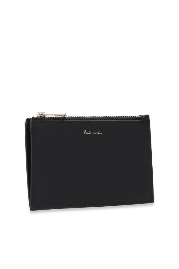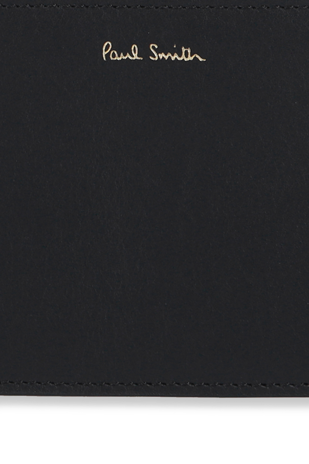 Black card holder from Paul Smith. Made of cow leather, this design is decorated with an embossed logo in gold-tone, multicolored stripe print and five card slots.