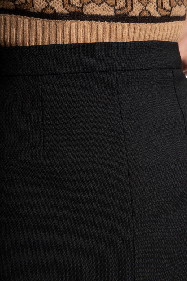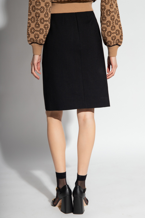 Black pencil skirt from Gucci. Made of wool, this style features a hidden back zipper with a hook & eye closure.