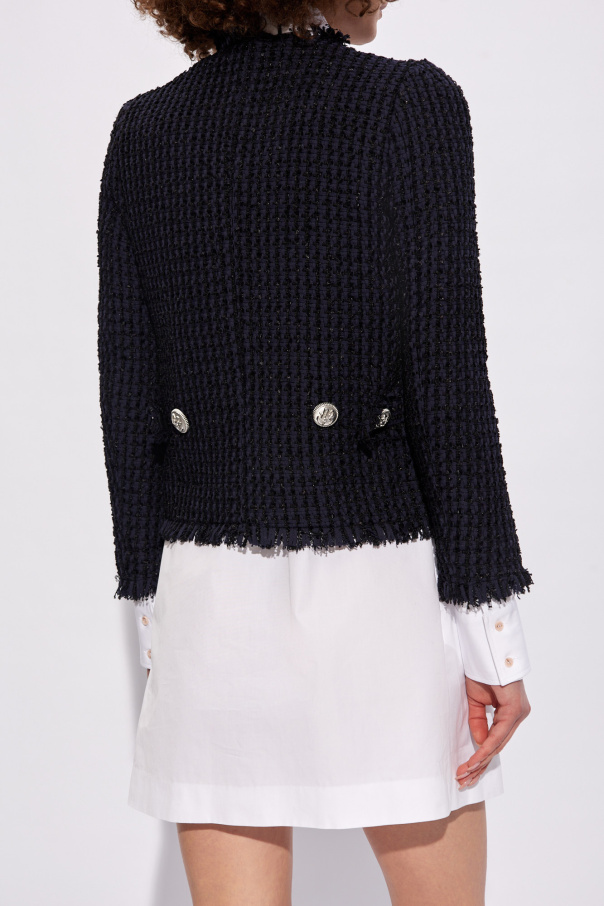 Navy blue and black tweed blazer from Dsquared2. Made of a blend of cotton and other materials, this style features silver-tone buttons with an engraved logo, two slip pockets and long sleeves.