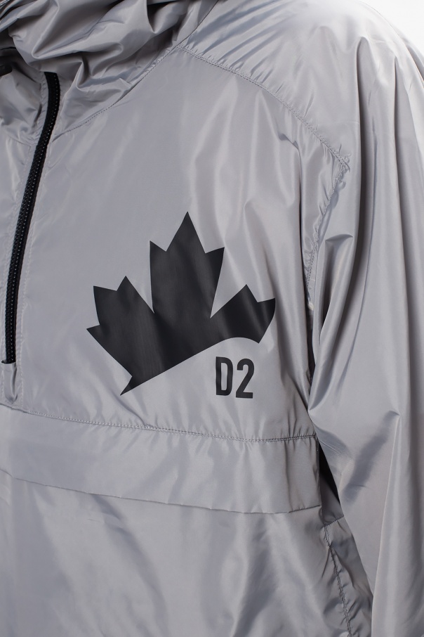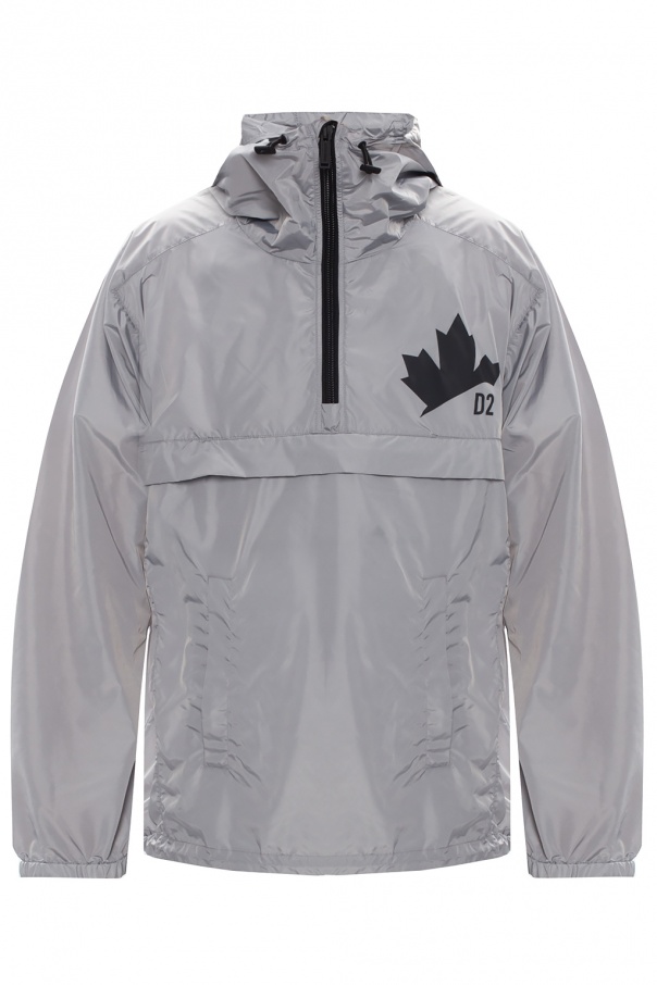 Grey jacket from Dsquared2. Fastened with a zip, this design features two slip pockets, one zip pocket, black logo print, drawstring hood and hem as well as long sleeves with ribbed cuffs.