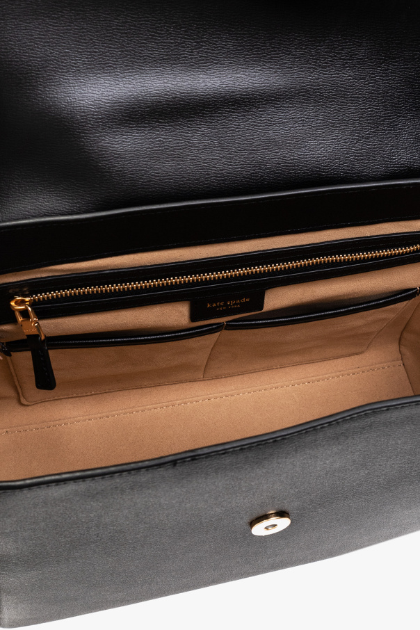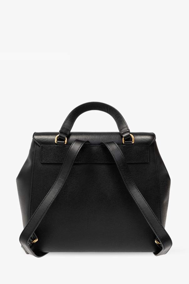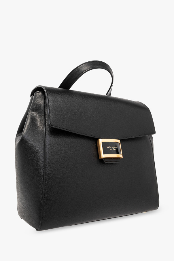 Black ‘Katy Medium’ backpack from Kate Spade. Made of leather, this design features a magnetic snap with a decorative logo buckle, half-round handle, adjustable shoulder straps, gold-tone metal hardware and one internal compartment with four slip pockets and one zip pocket.