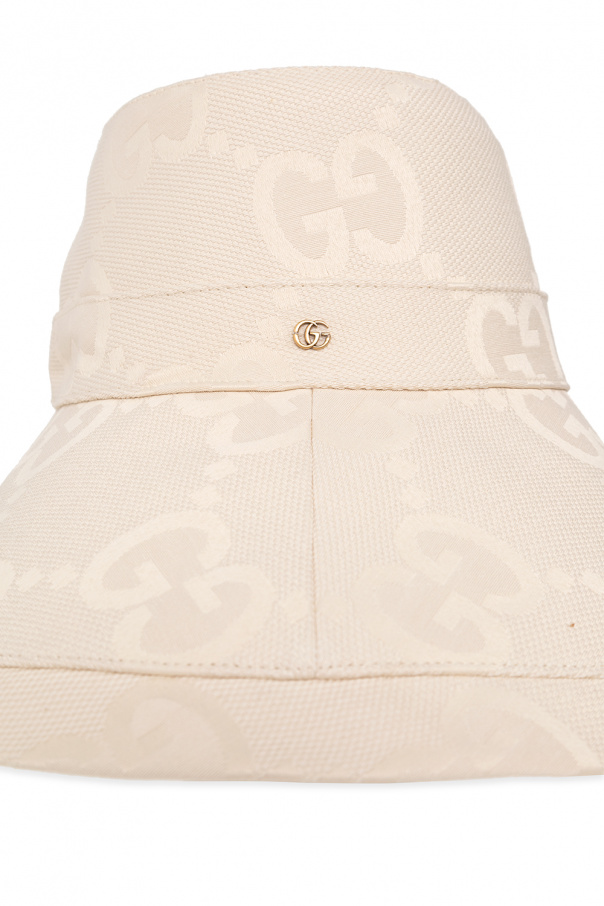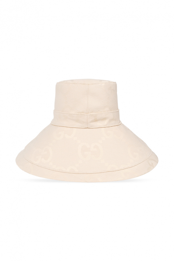 Cream hat from Gucci. Made from canvas, this item features a wide, sloping brim with a jacquard GG pattern and a gold-tone metal logo plaque on the side.