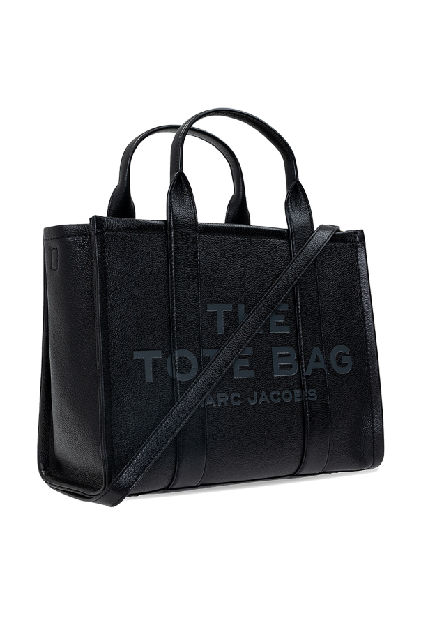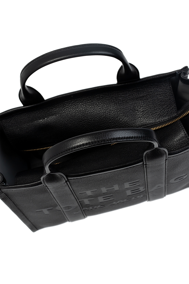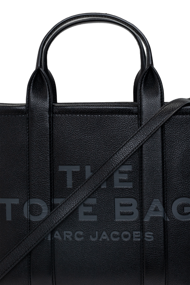 Black 'The Medium Tote' shopper bag from Marc Jacobs. Crafted from leather, this design features a zip fastening, embossed logo pattern in grey, two half-round handles, adjustable shoulder strap, gold-tone metal hardware and one internal compartment with two slip pockets and one zip pocket.
