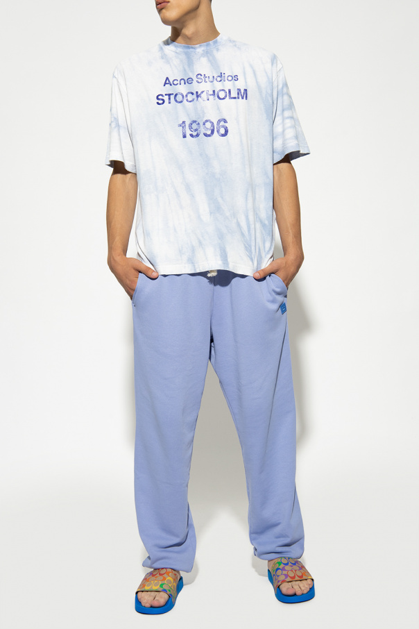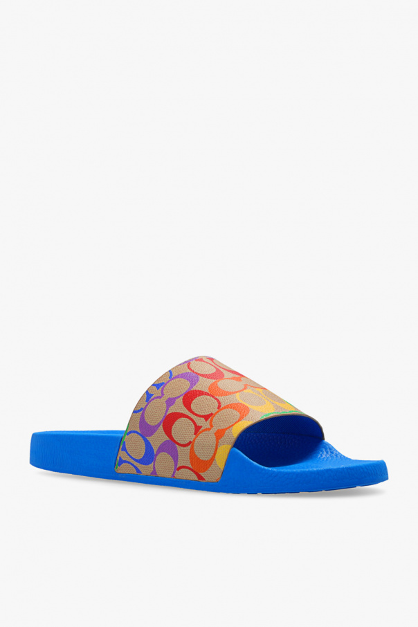 Beige slides from Coach. Crafted from canvas with a multicolored monogram print, this pair rests on a blue rubber sole.