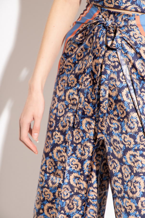 Multicolored sarong trousers from Salvatore Ferragamo. Made of silk, this pair features tie fastenings, wide, straight legs and ‘Gancio S’ pattern.