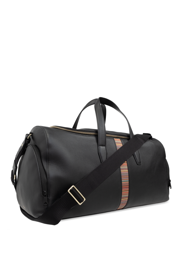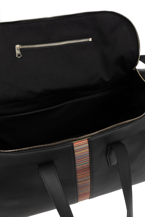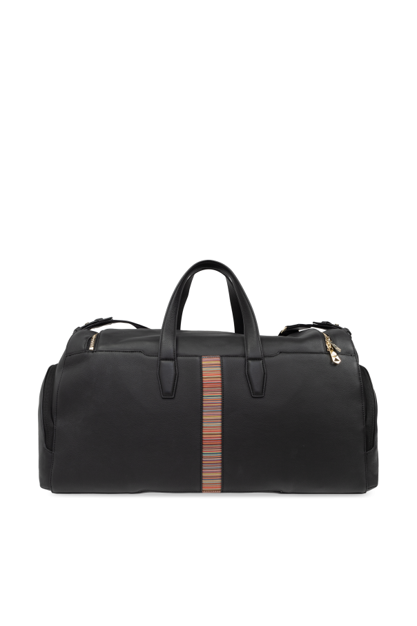 Introducing the epitome of sophistication and functionality - the Paul Smith Handheld Duffel Bag. Crafted from premium, smooth-textured material that mimics the luxurious feel of authentic leather, this exquisite piece is designed to elevate your travel and gym experiences to unparalleled heights. The bag's dominant black hue exudes a universal elegance, making it a versatile companion for any ensemble. It features two short handles for hand carrying and a long, adjustable, and detachable shoulder strap, enhancing its functionality. Distinctively, one side of the bag showcases a strip with a vertical pattern in shades of brown and orange, a characteristic designer accent that distinguishes it from the crowd. Security is paramount, and with its zip closure, your belongings are kept safe. The addition of at least one external zip pocket ensures easy access to essentials. Gold or brass-colored metal elements, like buckles and zipper ends, inject a dose of elegance, while precise stitching throughout indicates superior craftsmanship. Why Purchase This Product? Unmatched quality and design by renowned designer Paul Smith. Versatile and elegant, perfect for both travel and daily use. Functional design with multiple carrying options. Secure storage with zip closures and additional pockets. Unique designer accents, setting it apart from the mundane.