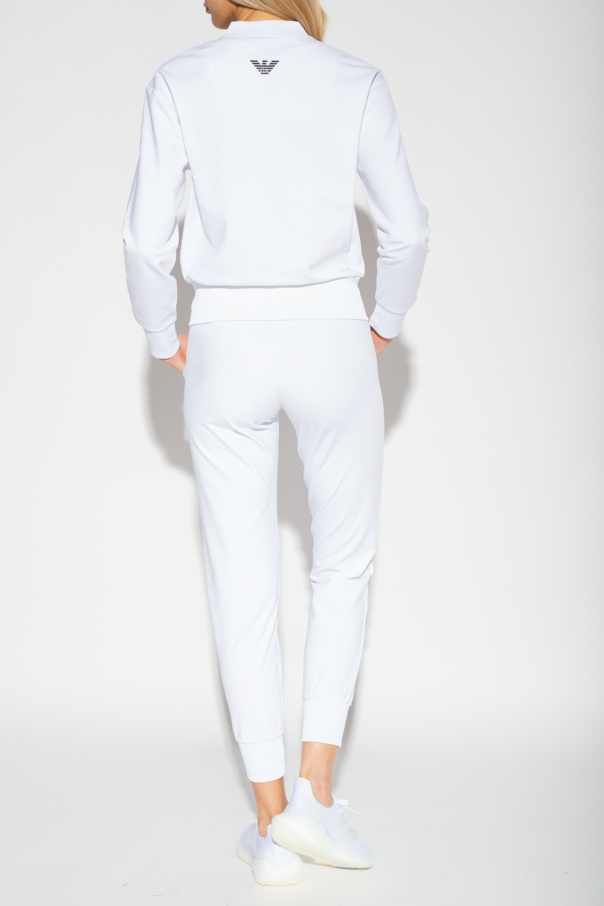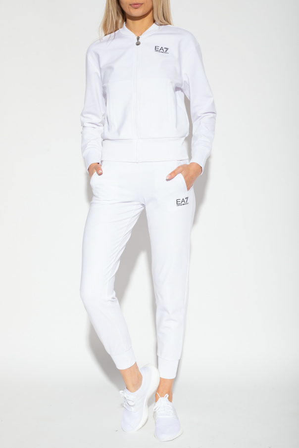 White track suit from EA7 Emporio Armani. Enriched by a black logo pattern, this set includes a zip-up top with two slip pockets and elasticized edges and sweatpants with a drawstring waistband, elasticated cuffs and two slip pockets.