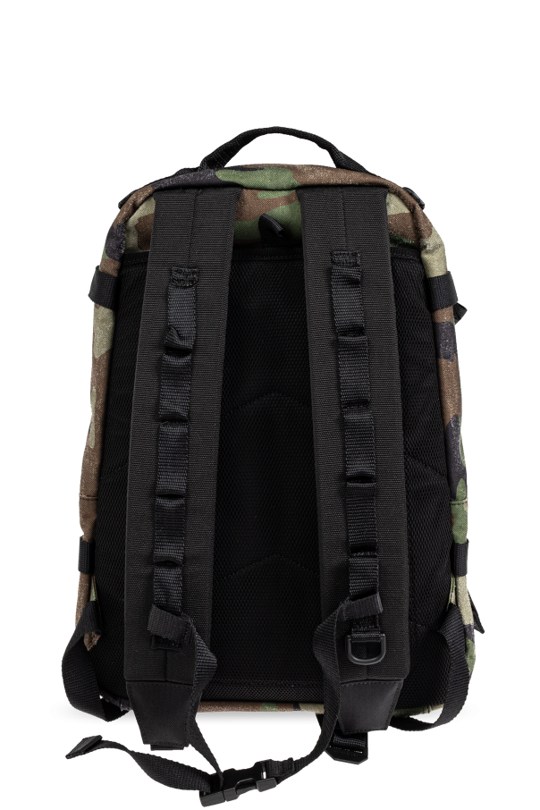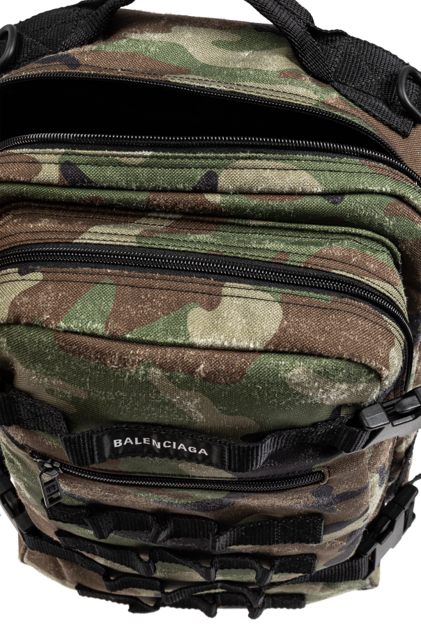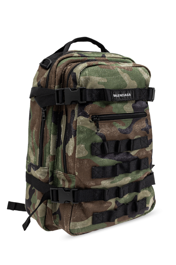 Experience the epitome of urban sophistication with the Balenciaga 'Army Space' Backpack. This exclusive piece from the renowned fashion house Balenciaga seamlessly blends military-inspired aesthetics with contemporary functionality. Crafted from a durable blend of poliamid and elastan, the backpack boasts a classic, rectangular silhouette adorned with multiple pockets and compartments. The dominant green hue is complemented by a striking camouflage pattern that merges shades of green, brown, and black, while the front features numerous straps and loops, enhancing its rugged appeal. The front pocket, secured with a zip closure, prominently displays the iconic "BALENCIAGA" logo in white. Compression straps with buckles allow for adjustable volume, and the backpack's padded back and shoulder straps ensure maximum comfort during wear. Additionally, the shoulder straps are equipped with supplementary loops for attaching extra accessories. The interior is equally impressive, featuring a rear compartment for a laptop, two main compartments, one with three slip pockets and the other with a zippered pocket, ensuring meticulous organization. A hand-carry handle at the top adds to its versatility. Why Choose This Product? Exclusive Design: From the prestigious house of Balenciaga, known for its visionary and masterful haute couture. Durable Materials: Constructed from resilient poliamid and elastan, ensuring longevity. Functional Layout: Multiple compartments and pockets for optimal organization, including a dedicated laptop slot. Comfortable Wear: Padded back and straps for enhanced comfort. Stylish Aesthetics: Military-inspired design with a modern twist, perfect for urban fashion.